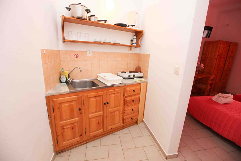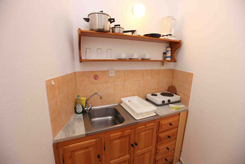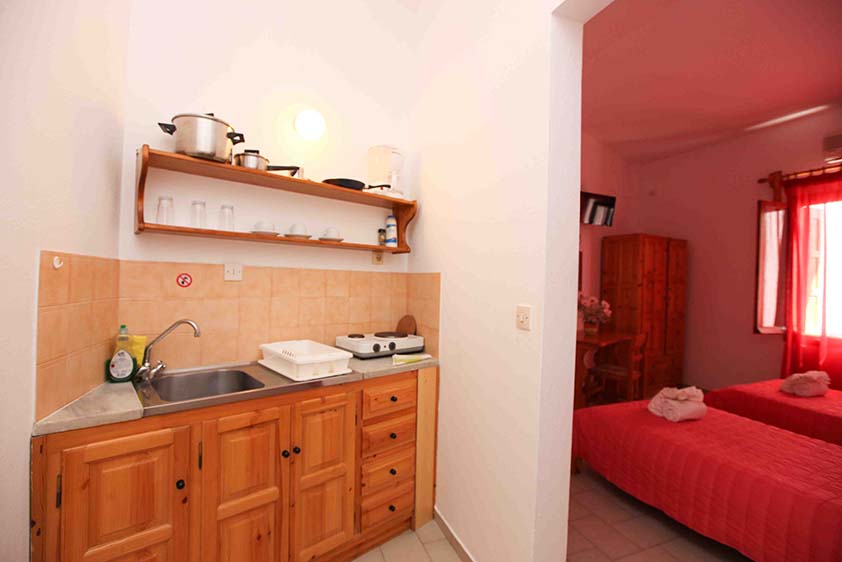- Οικονομικό δίκλινο studio με δύο μονά κρεβάτια (υπάρχει η δυνατότητα να γίνει διπλό, βάζουμε latex στη μέση), κουζίνα και παράθυρο.