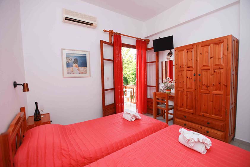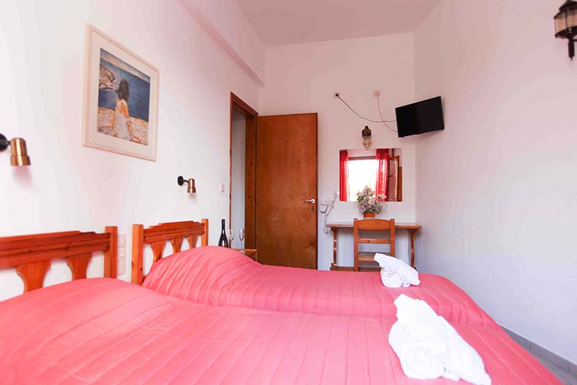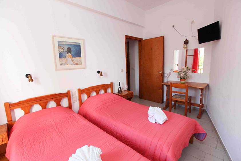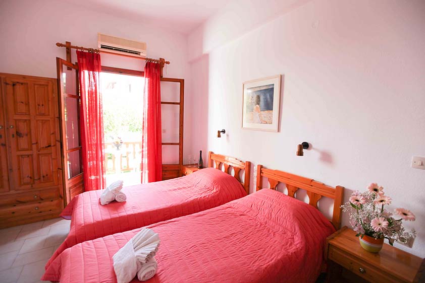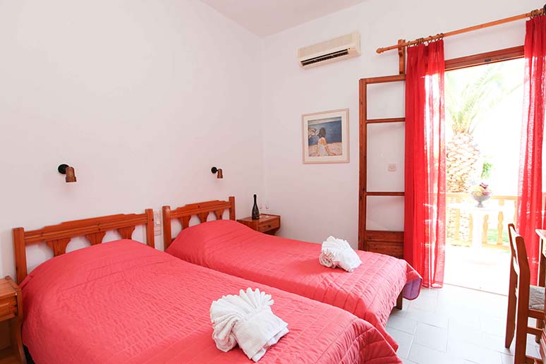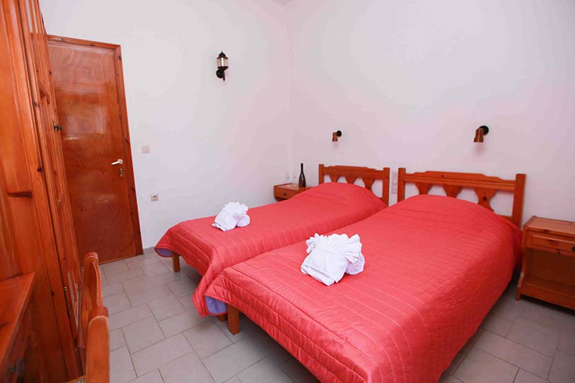 Τετράκλινο με 2 υπνοδωμάτια Τετράκλινο με δύο υπνοδωμάτια με τέσσερα μονά κρεβάτια (υπάρχει η δυνατότητα να γίνουν διπλά, βάζουμε latex στη μέση) ένα μπάνιο, θέα και πρόσβαση στο κήπο.