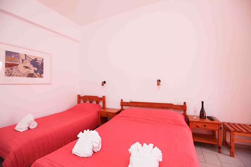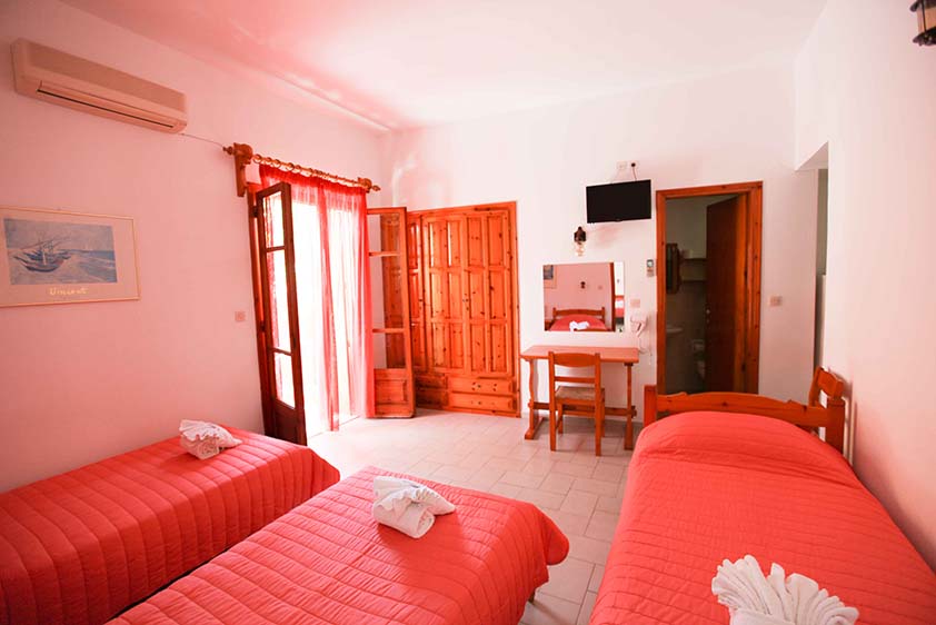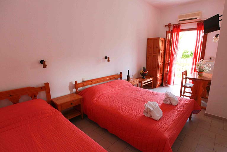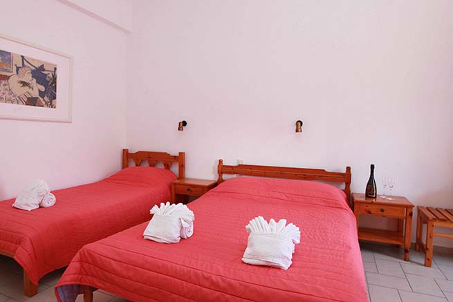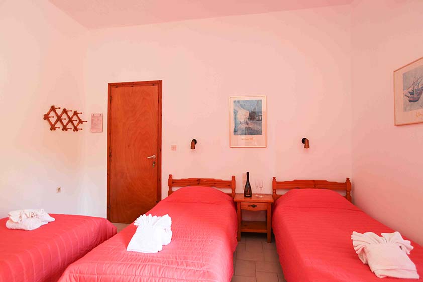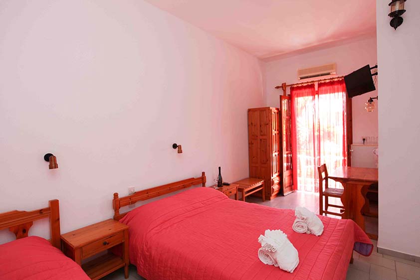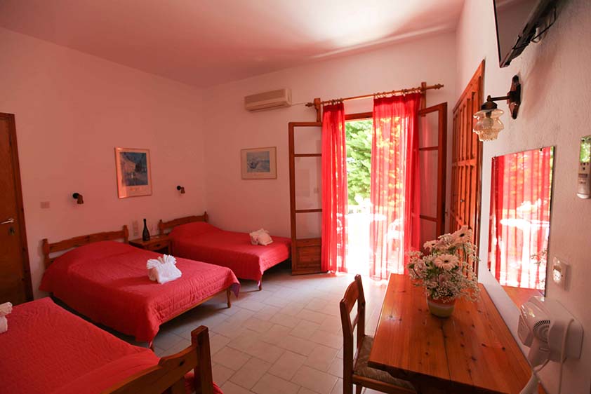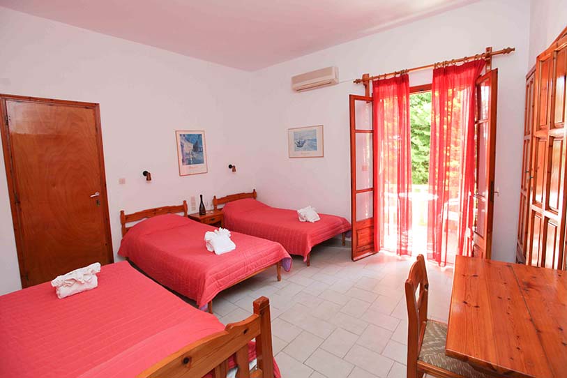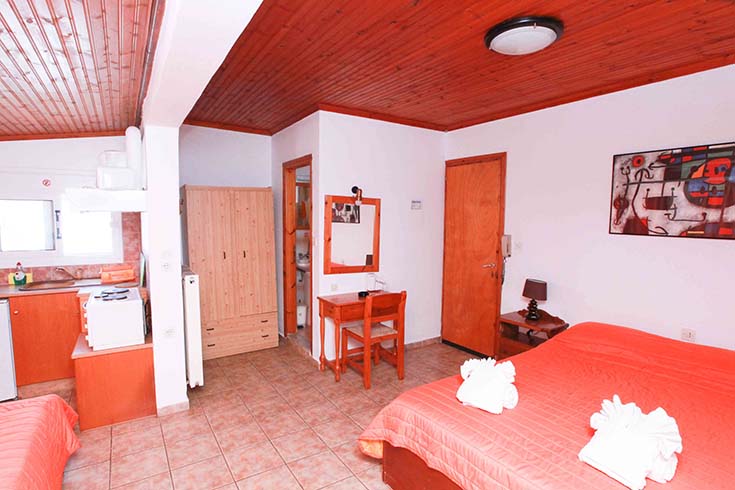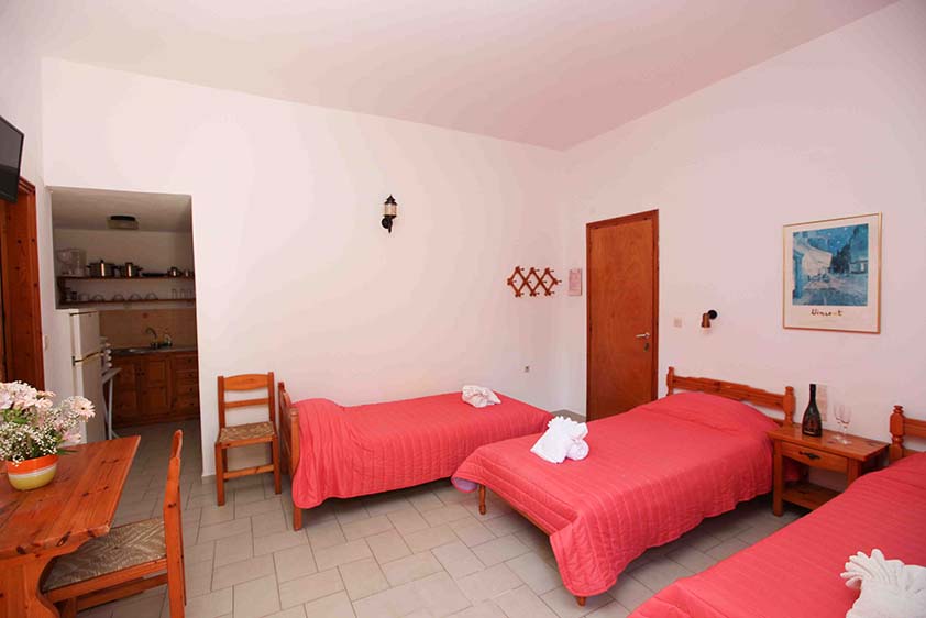 - Τρίκλινο studio με κουζίνα με τρία μονά κρεβάτια (υπάρχει η δυνατότητα να γίνουν τα δύο ένα διπλό, βάζουμε latex στη μέση) με μπαλκόνι, θέα και πρόσβαση στο κήπο.