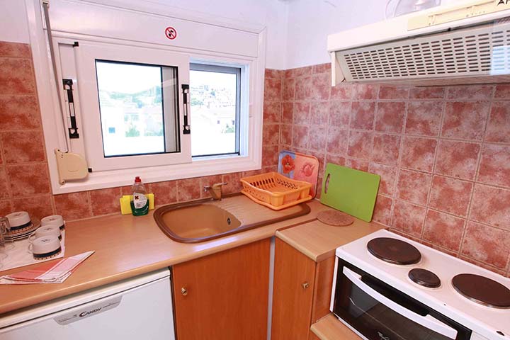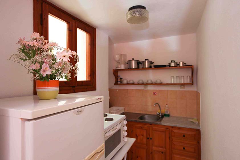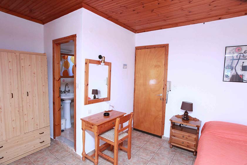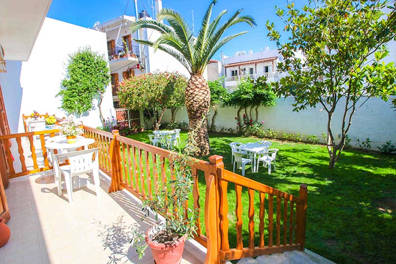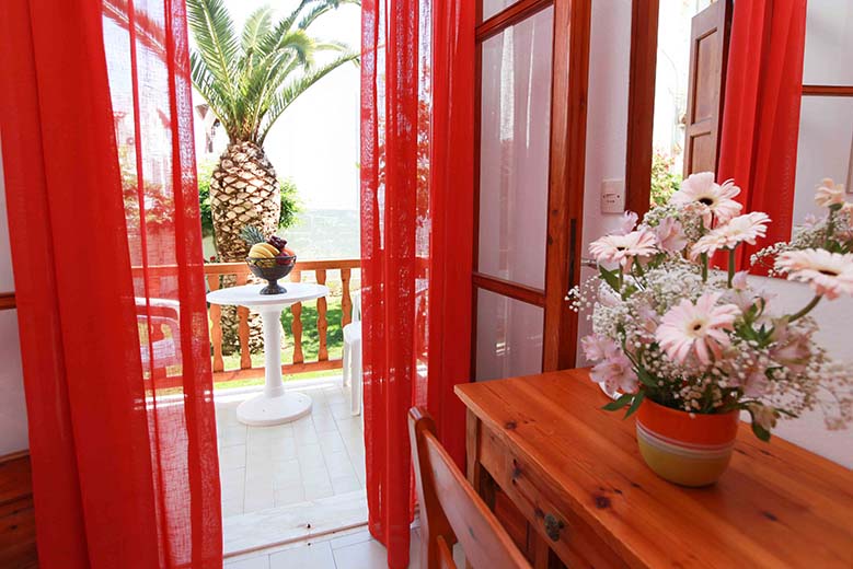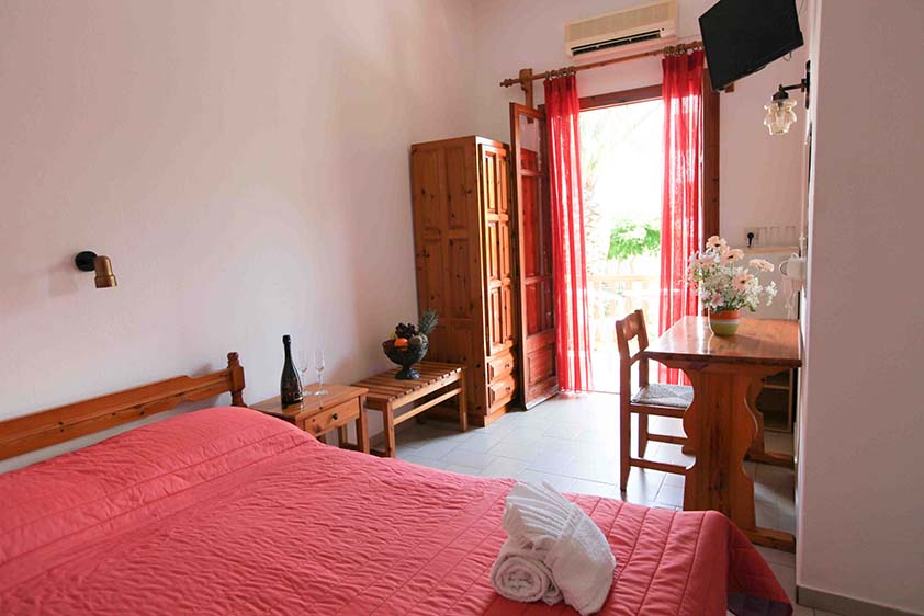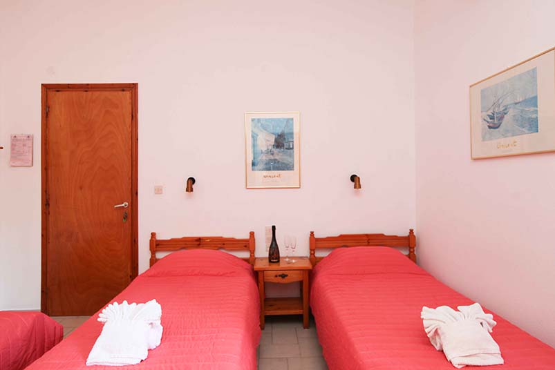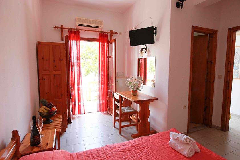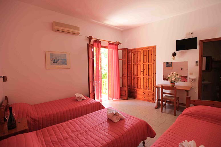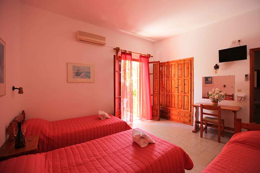 - Τρίκλινο studio με κουζίνα με τρία μονά κρεβάτια (υπάρχει η δυνατότητα να γίνουν τα δύο ένα διπλό, βάζουμε latex στη μέση) με μπαλκόνι, θέα και πρόσβαση στο κήπο.